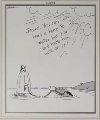 Rock er en kilde til humor, og noen lesere har virkelig funnet den Fjern siden's Vitser om Gud og Jesus må stole på denne årsaken til tegneserien og til og med kritikerne. Taleskyen forble her. Det ser ut som sønnen din. Jesus, du kan ta en hest til vannet, men du kan ikke følge deg selv.