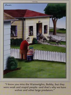 ' Jeg kjenner Wainwright, Bobby, mengde Mannen sier at han ser på det hvite gjerdet til sønnen. Jeg så noen ulver krysse huset ved siden av. Men de var svake og dumme mennesker 。 '' Fremmed Fjern siden Punch Line, Gary Larson, tilbyr litt forvirring.