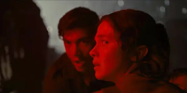 Tyler (Archie Renaux) og Rain (Cailee Spaeny) looking around in fear in Alien: Romulus
