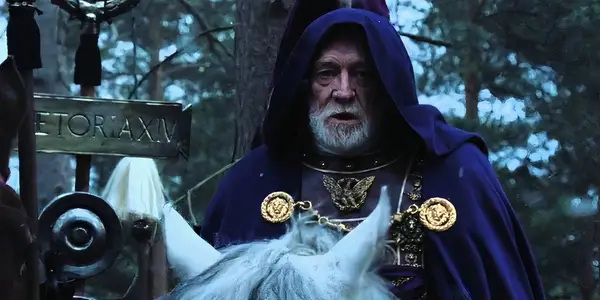 Richard Harris som Marcus Aurelius sitter på en hest med en hette kappe i Gladiator (2000)