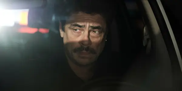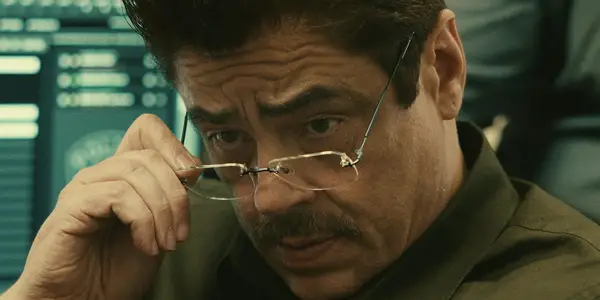 Benicio del Toro furer brynet og ser bekymret ut i reptilen.