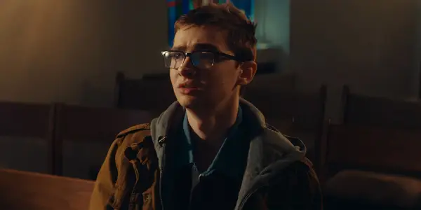 Elliot Fullam mens Jonathan ser redd ut mens han setter seg ned i en kirke i skremmende 3