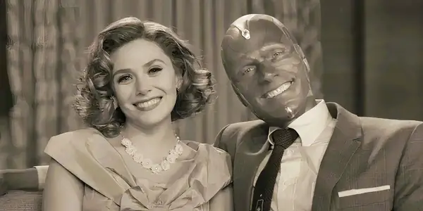 Wanda Maximoff og syn i svart og hvitt smilende i wandavision